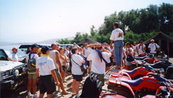 à notre bivouac avec notre minibus. Initiation au quad sur notre piste privée, mise à disposition d'un casque laser, lunettes Scott, gants Segura, et chèche.