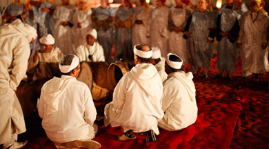 Petit déjeuner. Départ pour Ouarzazate pas la piste du Draa, longeant l’oued du même nom, à travers désert et oasis. Le fond de la vallée, verdoyant, contraste avec la montagne aride ; dans les hameaux perdus la vie se déroule de la même façon depuis plusieurs siècles. Sortie de la piste à Tansikht. Continuation à travers une montagne aride offrant de magnifiques paysages de canyons. Arrêt à Agdz puis continuation pour Ouarzazate. Déjeuner. Route pour Marrakech puis pour le domaine Couleurs Berbères. Dîner traditionnel animé par la troupe folklolrique locale HoumadaFeu de camp. Nuit